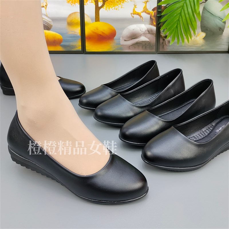 工作鞋女黑色平底空姐鞋软底圆头皮鞋职业浅口单鞋妈妈鞋中老年鞋