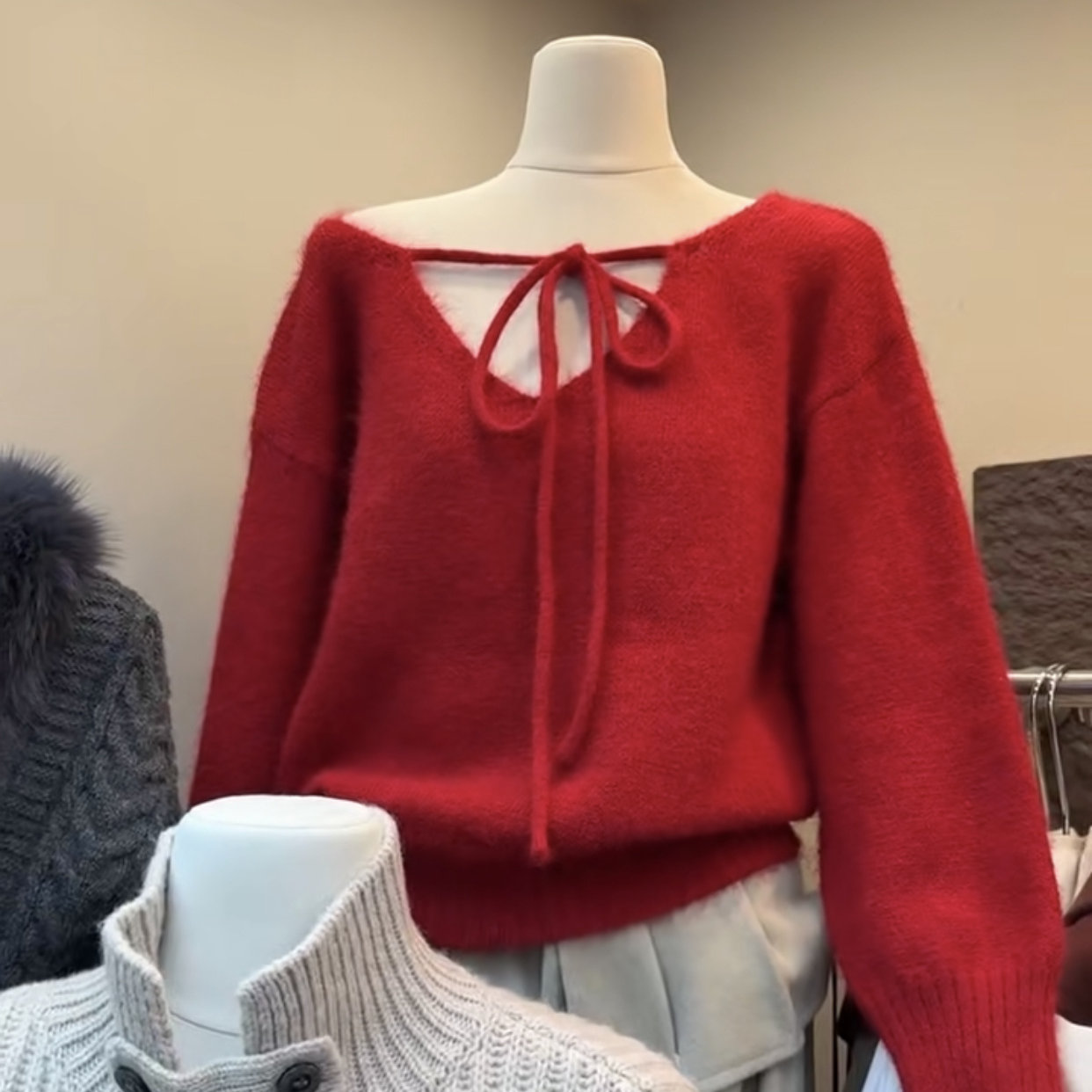 AT fashion露背系带蝙蝠袖毛衣女秋冬氛围感长袖针织衫毛衣圣诞红
