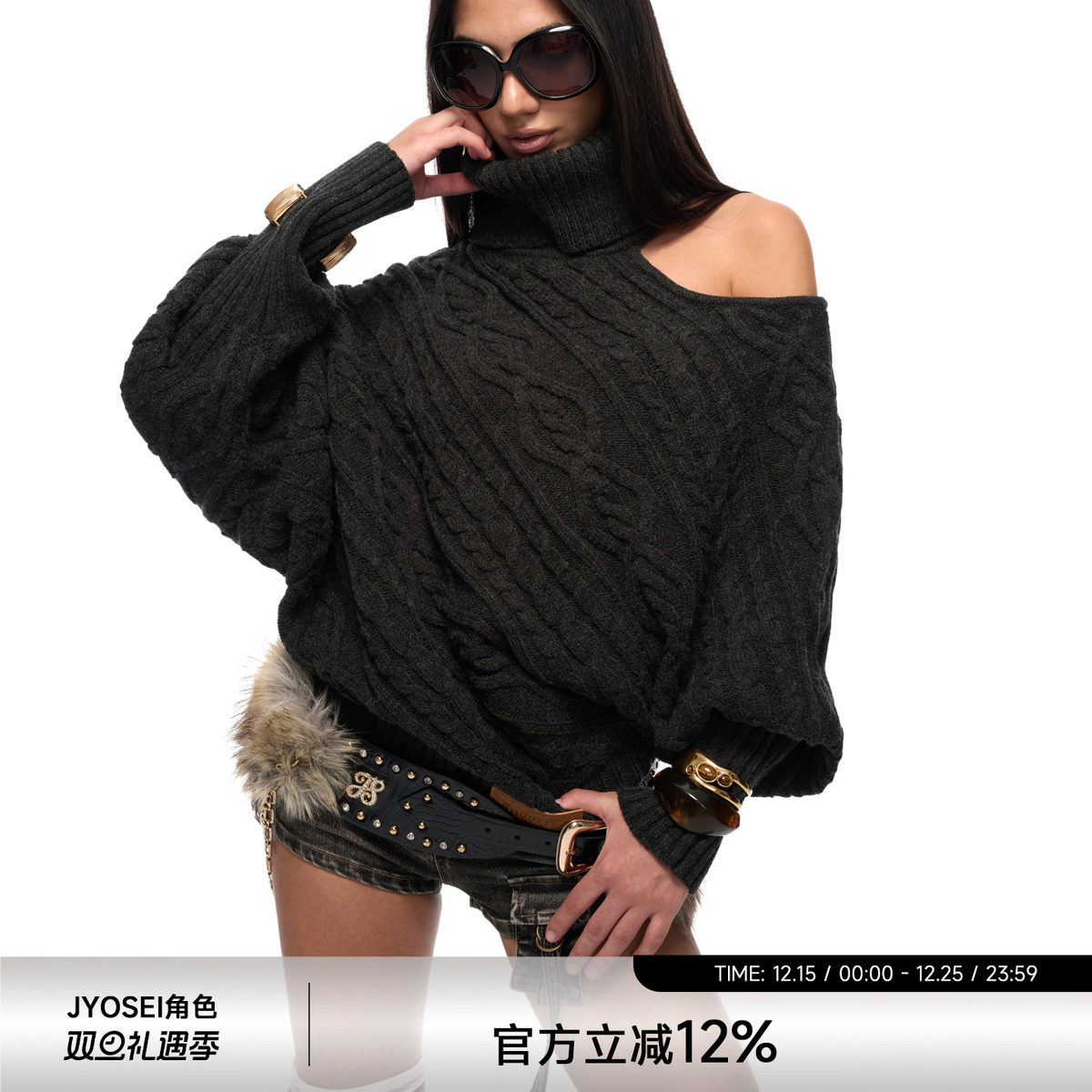 JYOSEI角色原创含羊毛Y2K辣妹不规则漏肩毛衣麻花蝙蝠长袖针织衫