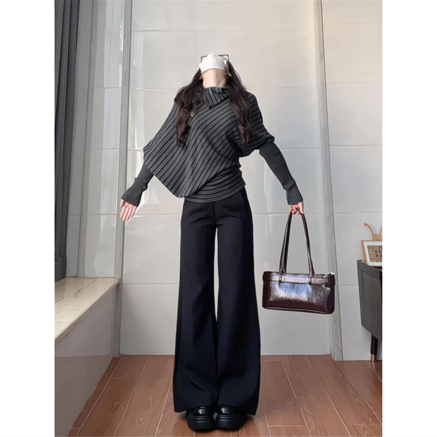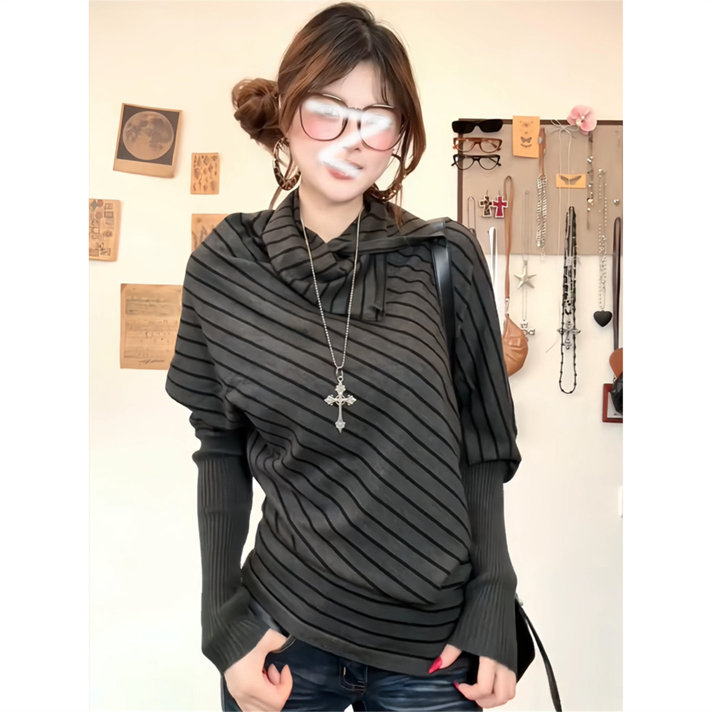 复古黑灰条纹不规则打底针织衫女秋冬韩系蝙蝠袖宽松长袖毛衣上衣