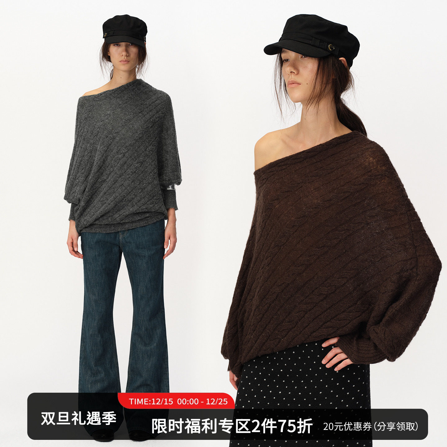 SMIIILE蝙蝠袖软糯一字领针织衫斜肩绞花露肩慵懒感宽松长袖上衣