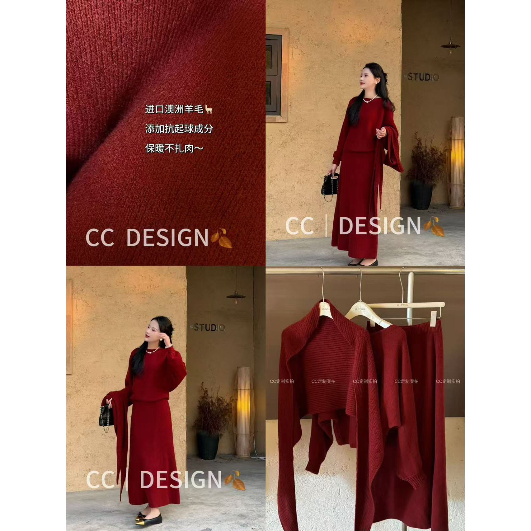 小雯~冬季时髦圣诞节蝙蝠长袖针织衫毛衣+披肩+半身裙三件套装女