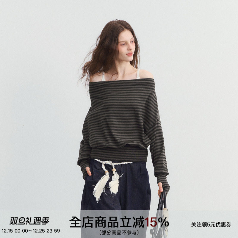 SPEAR YOUTH“遐想思绪”条纹一字肩针织衫蝙蝠袖长袖上衣毛衣