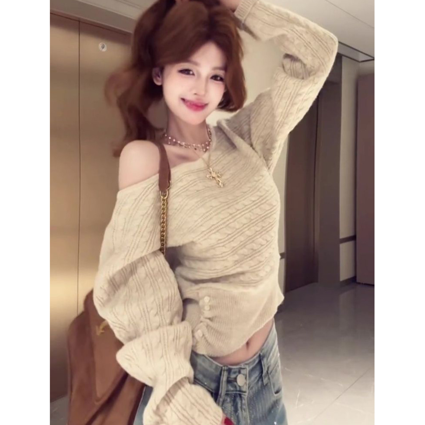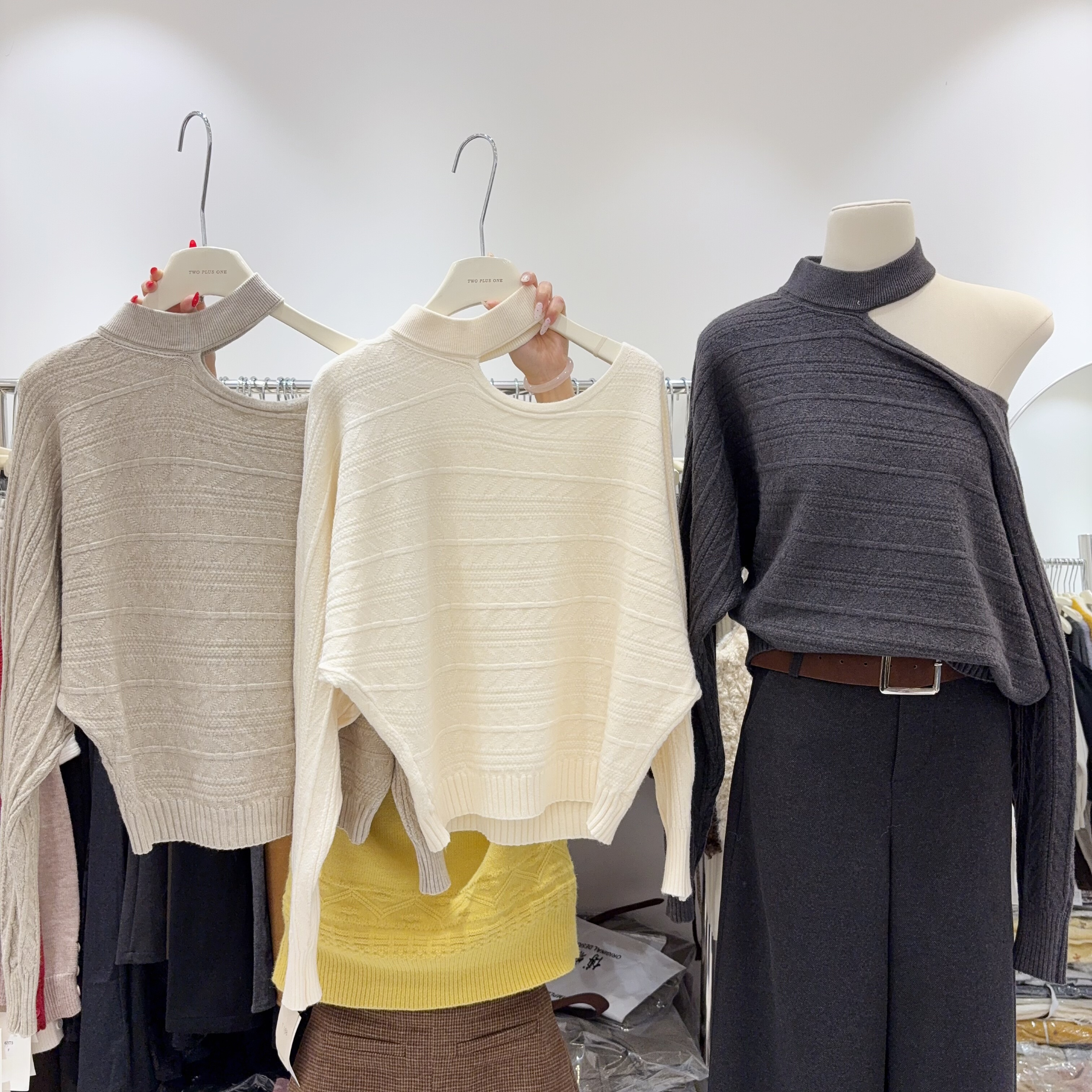 韩系慵懒斜肩软糯长袖针织衫女秋冬新款蝙蝠袖设计感百搭收腰毛衣