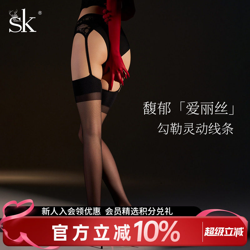 sk「繁梦引」黑丝女薄款防勾丝黑色性感吊带袜情调蕾丝一体长筒袜