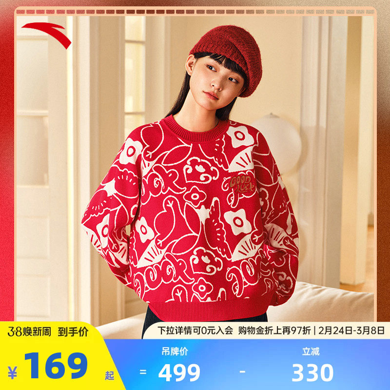 安踏好事发生丨新年红色毛衣女款宽松百搭卫衣针织上衣马年本命年