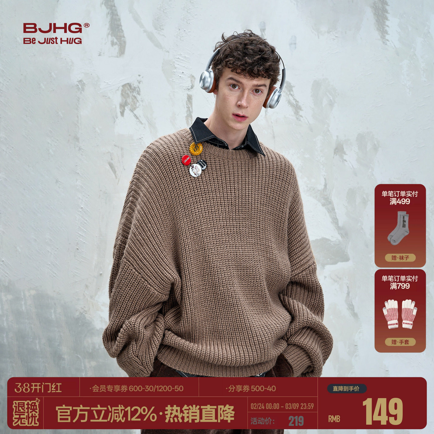 BJHG不计后果复古圆领毛衣男款冬季卫衣简约宽松针织衫情侣毛衣女
