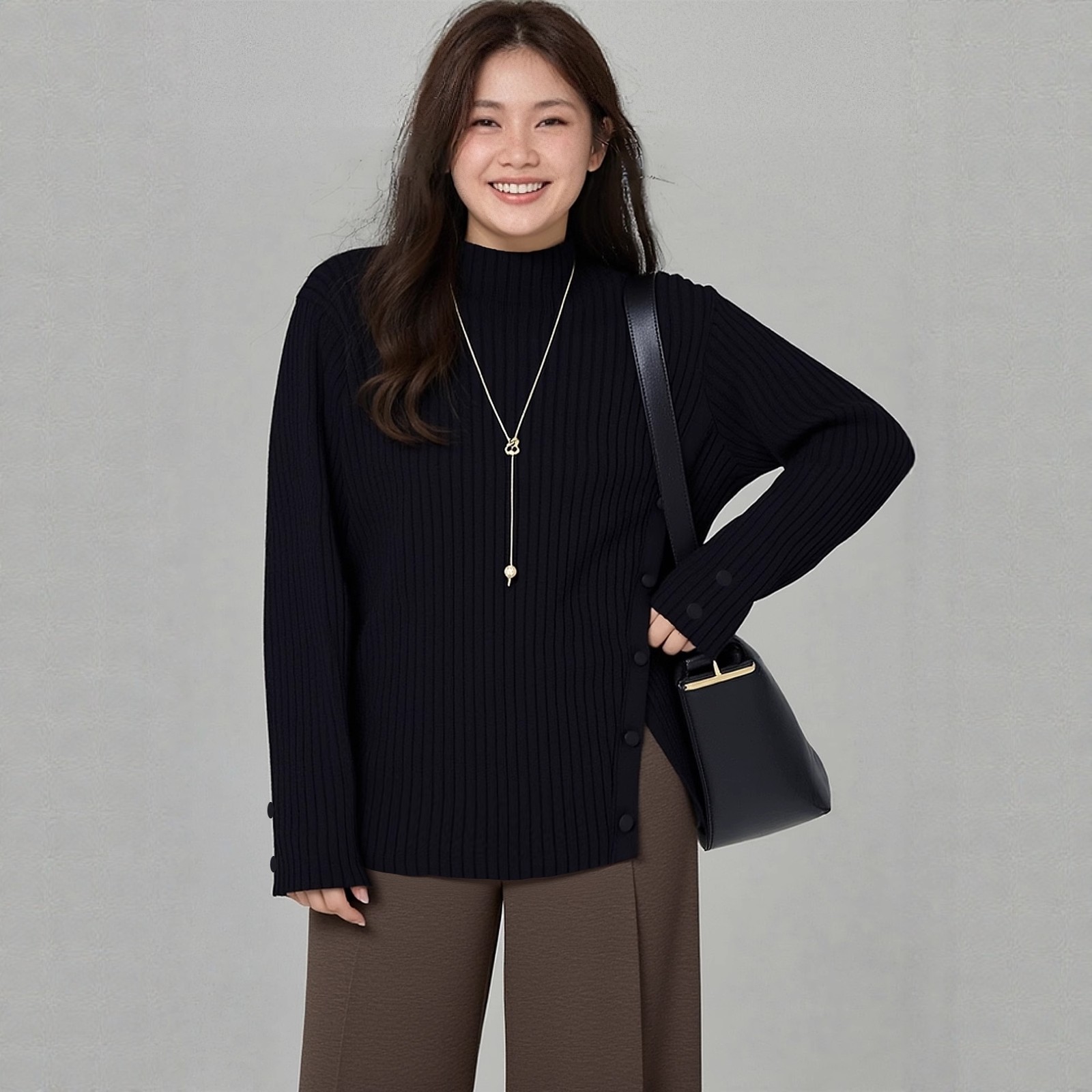 2025秋冬新款半高领加厚修身打底衫毛衣纽扣开叉袖子上衣针织衫女