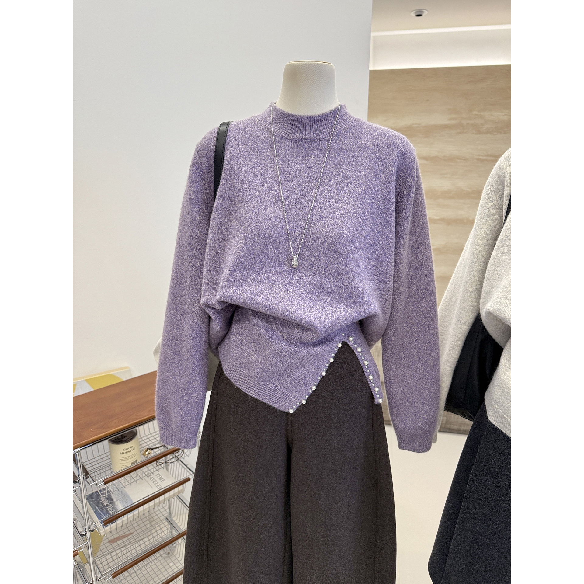 下摆开叉钉珠半高领软糯保暖宽松韩系冬款高级气质套头针织毛衣女