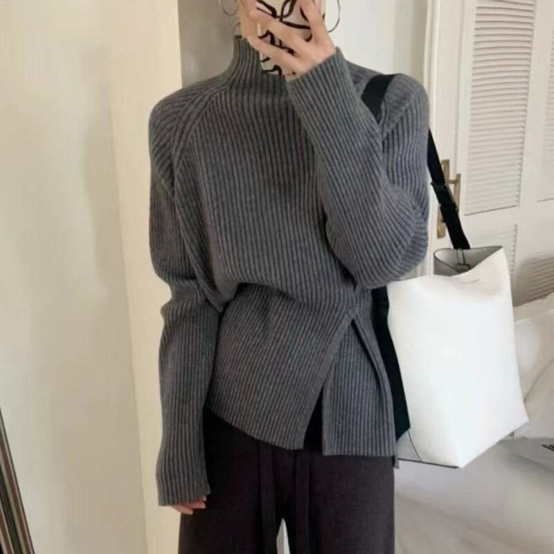 纯棉线半高领加厚针织衫女2024冬季宽松慵懒风开叉毛衣纯色打底衫