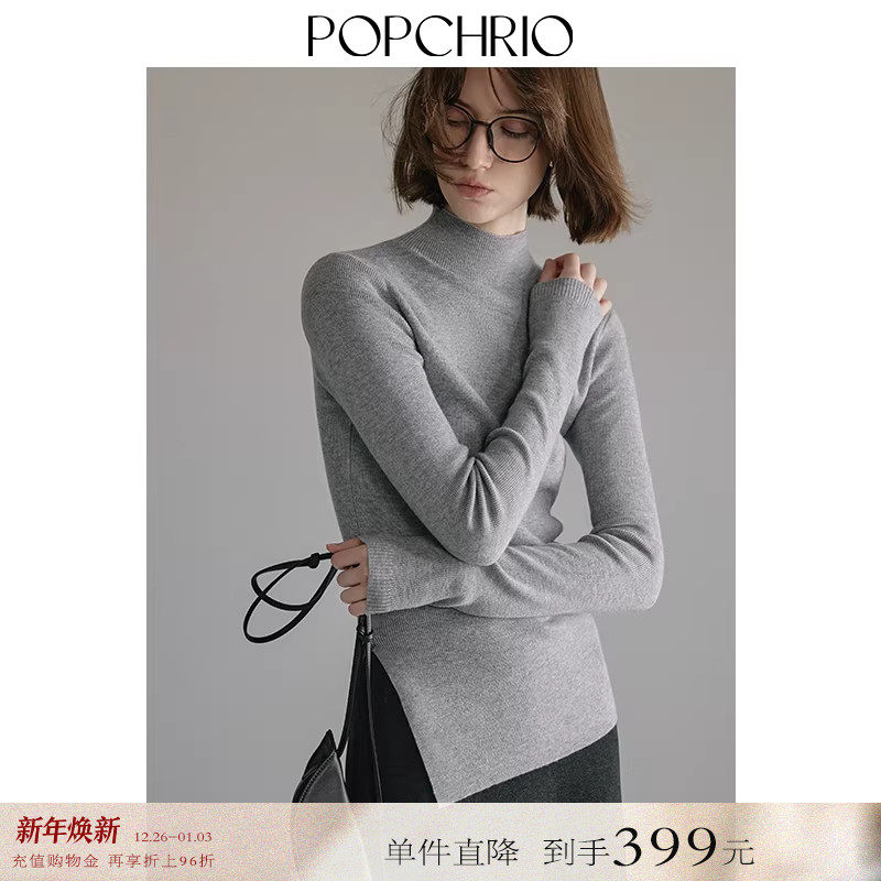【到手399元】可机洗半高领侧开叉羊毛针织衫收腰套头内搭毛衣女