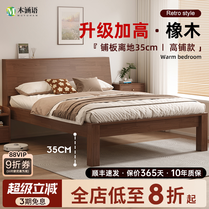 橡木床实木双人床1米8家用床离地高床底可储物1米2单人床1.5米床