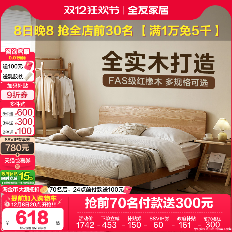 政府补贴全友家居实木悬浮床橡木1米5单人床架卧室1米8双人储物床