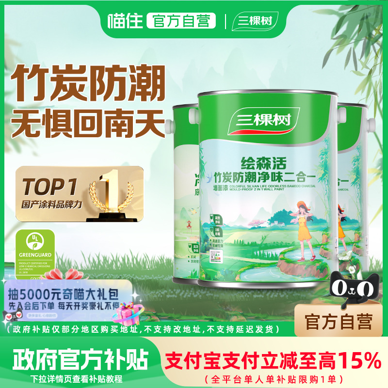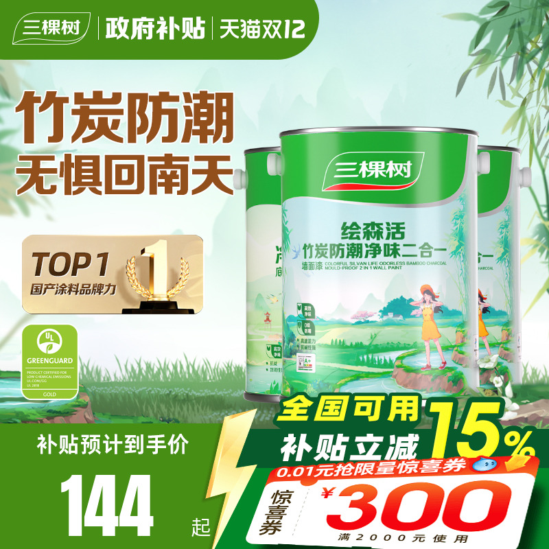 三棵树乳胶漆竹炭防潮二合一室内油漆家用涂料墙漆自刷内墙漆白色
