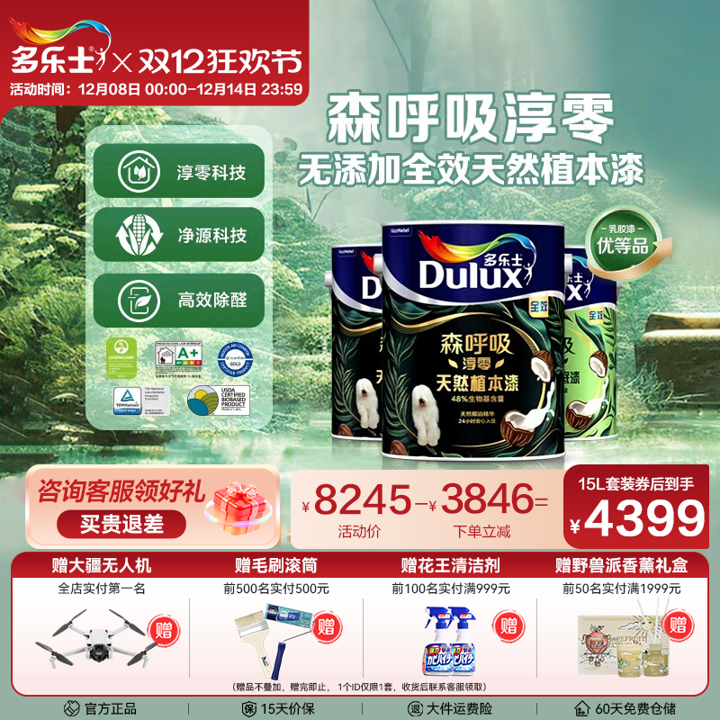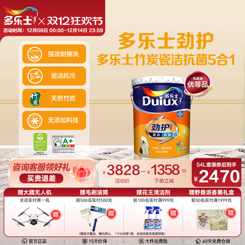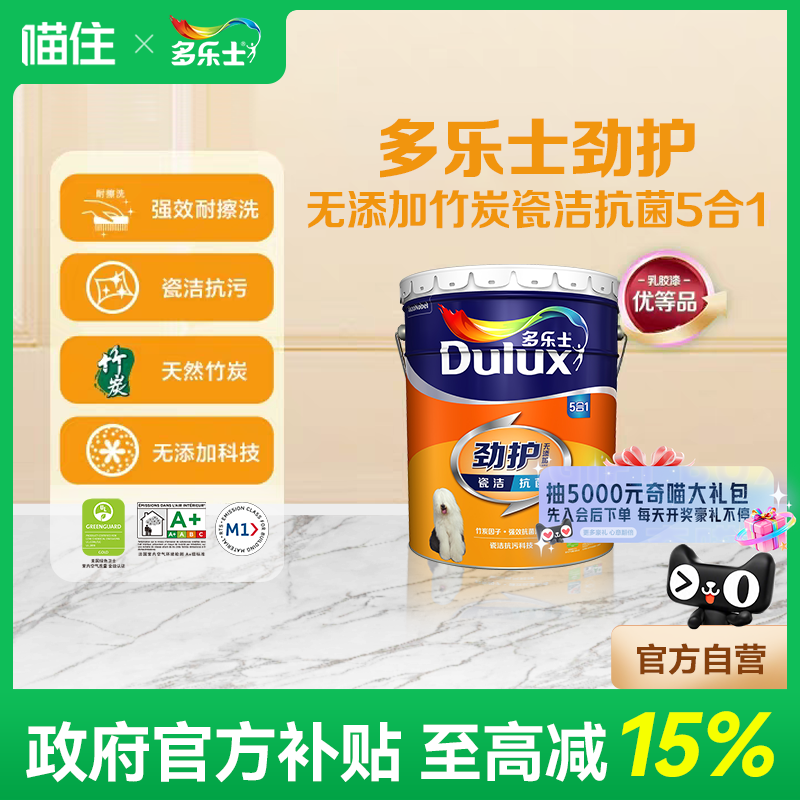 多乐士乳胶漆劲护瓷洁五合一家用室内油漆涂料环保竹炭白色墙面漆