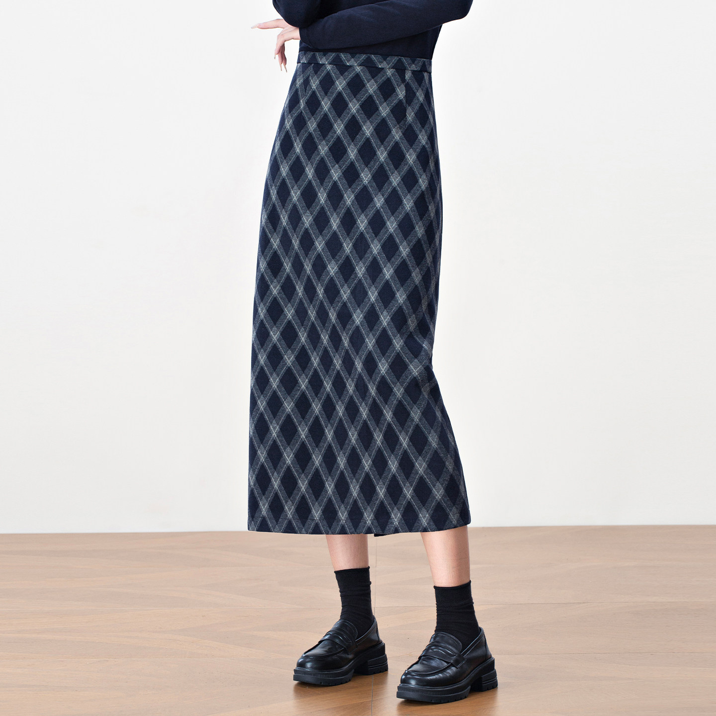 毛呢格子半身裙女秋冬季高腰开叉直筒格纹裙中长款加绒包臀长裙子