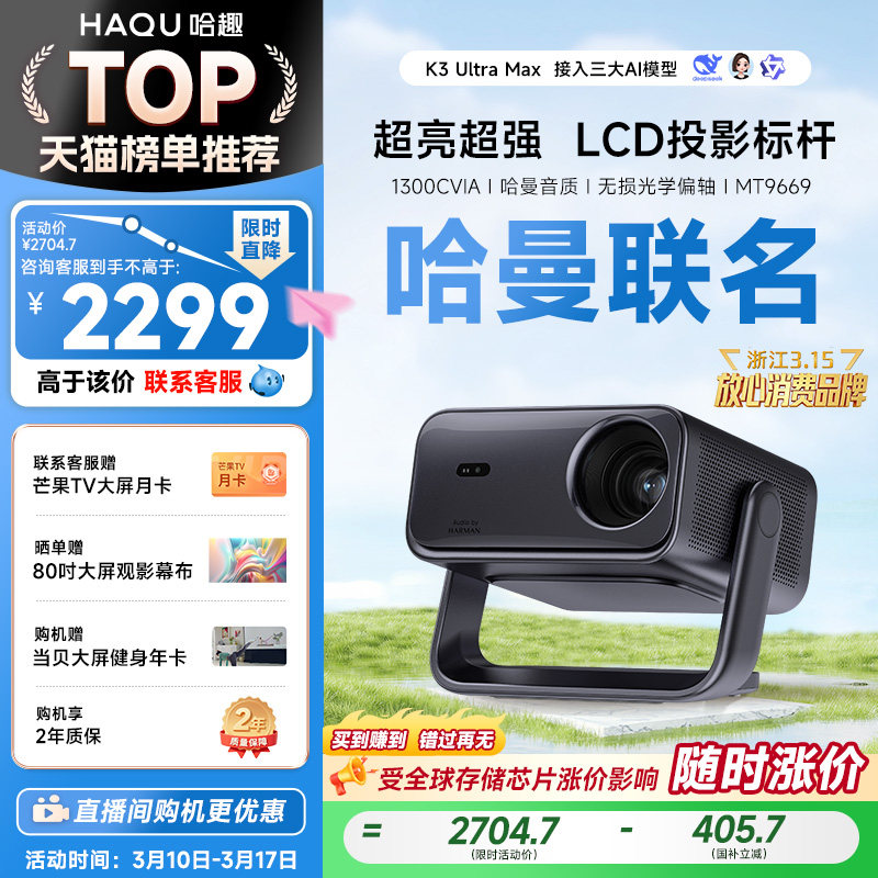 【政府补贴15%】哈趣K3UltraMax投影仪家用超高清可连手机哈曼联名新款1080P智能家庭影院投屏卧室客厅投影机