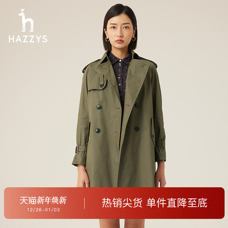 Hazzys哈吉斯宽松版双排扣中长款风衣女士春秋季英伦风通勤外套