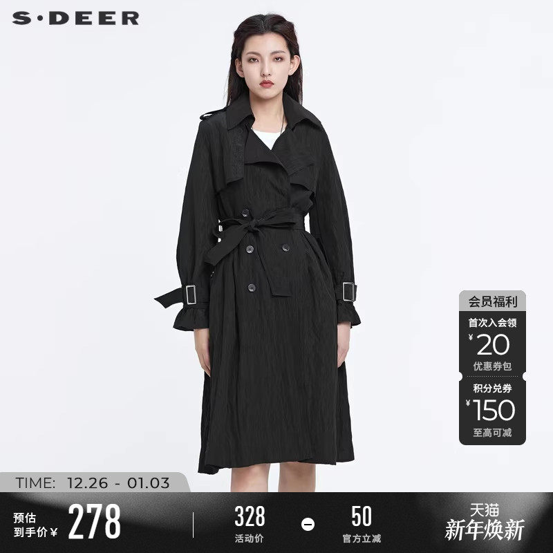 sdeer圣迪奥春秋装女装西装领收腰双排扣中长款风衣外套S22181809