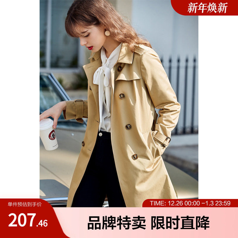 浦言延同款英伦风双排扣中长款风衣女通勤收腰外套卡其色过膝大衣