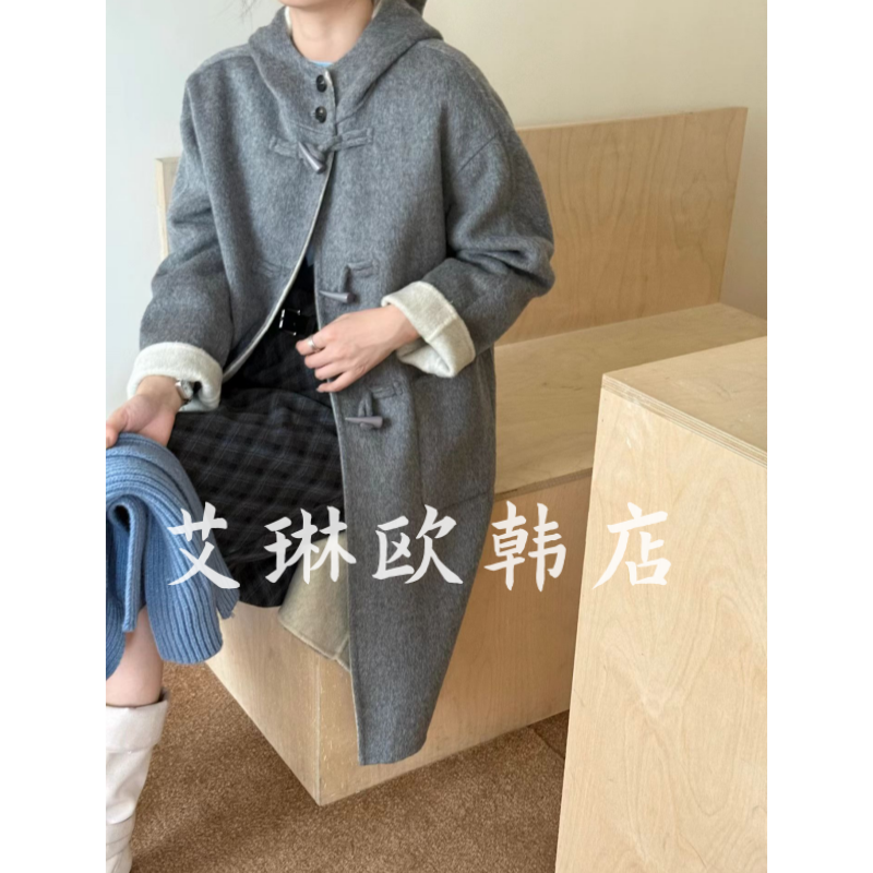 福利K862冬新款连帽牛角扣100澳洲超细羊毛双面羊绒大衣外套女