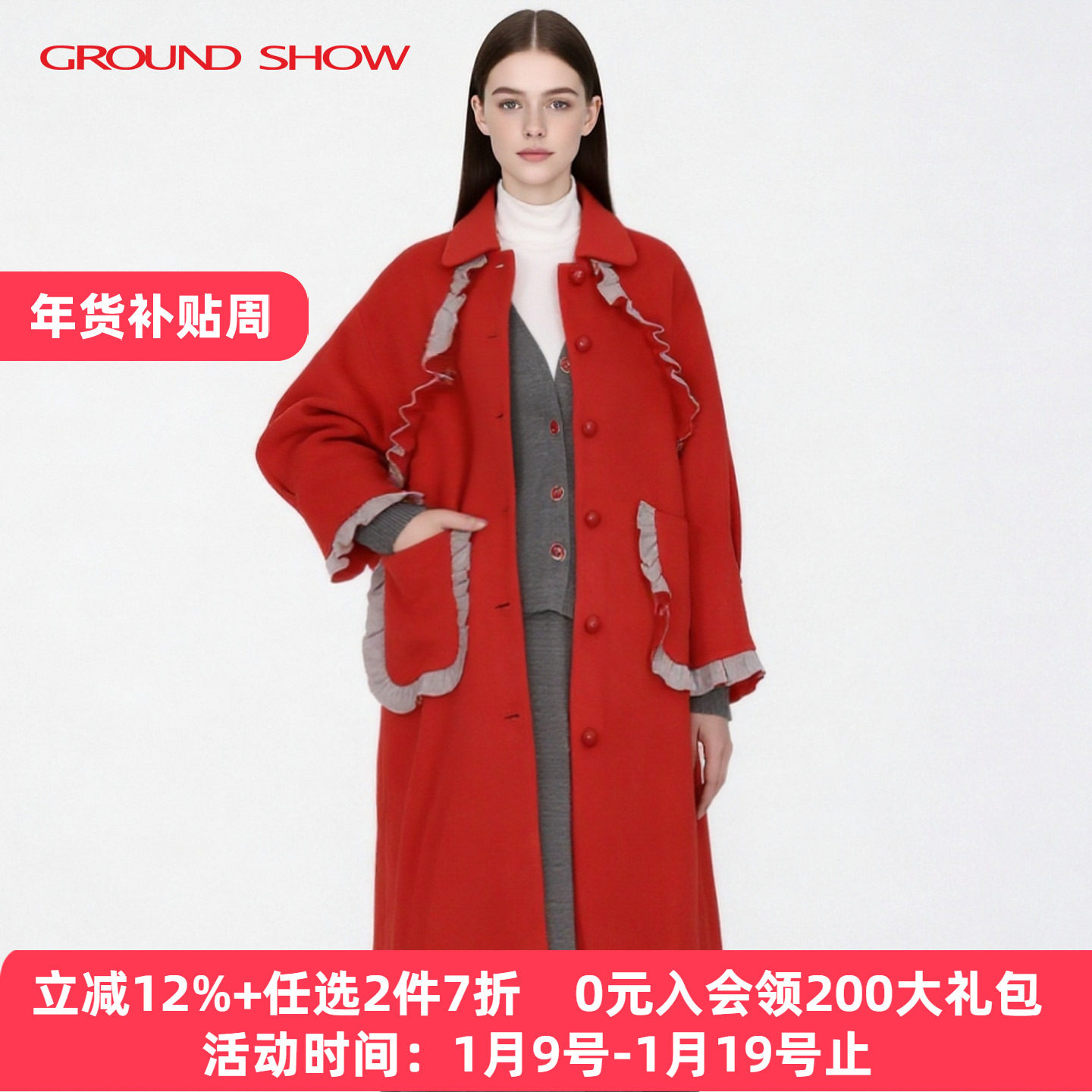 【专柜款】阁兰秀2025年秋冬新品赤焰红双面呢羊毛羊绒大衣外套女