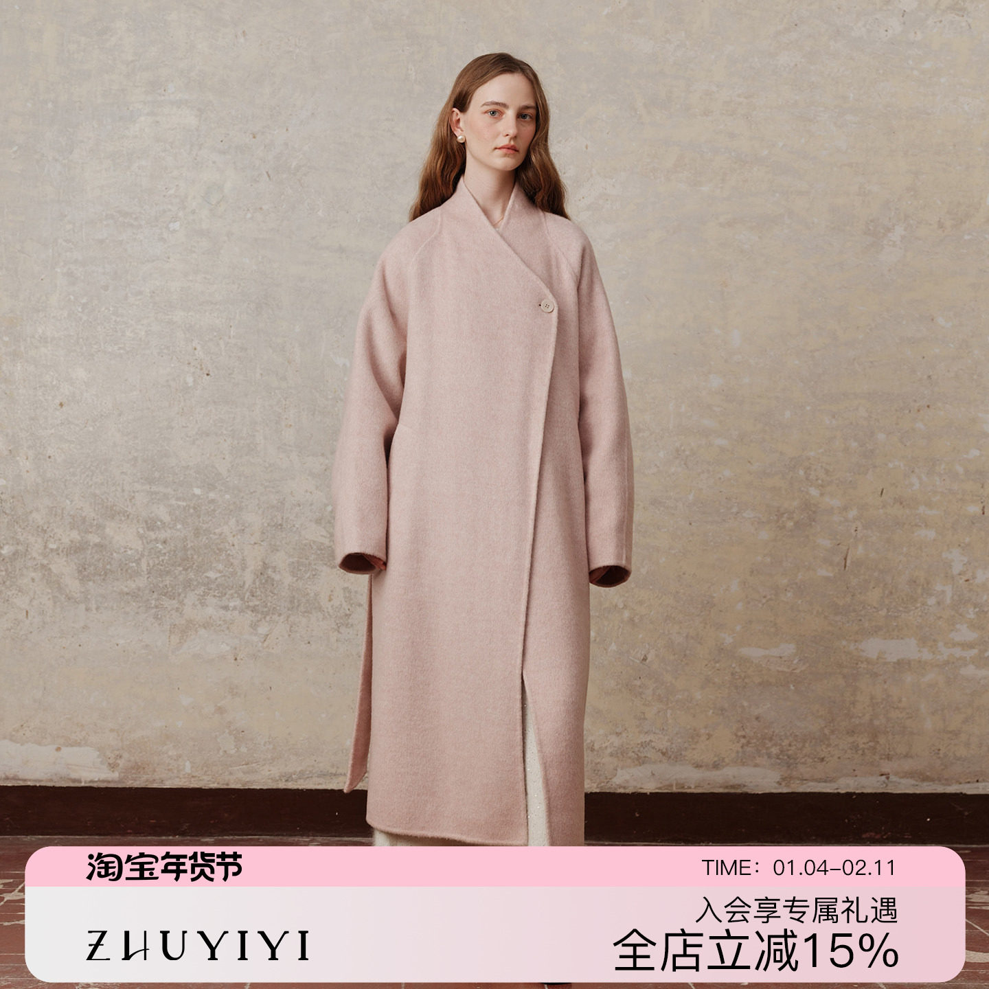 ZHUYIYI 温柔风新款高级感系带粉色山羊绒大衣外套女秋冬长款无领