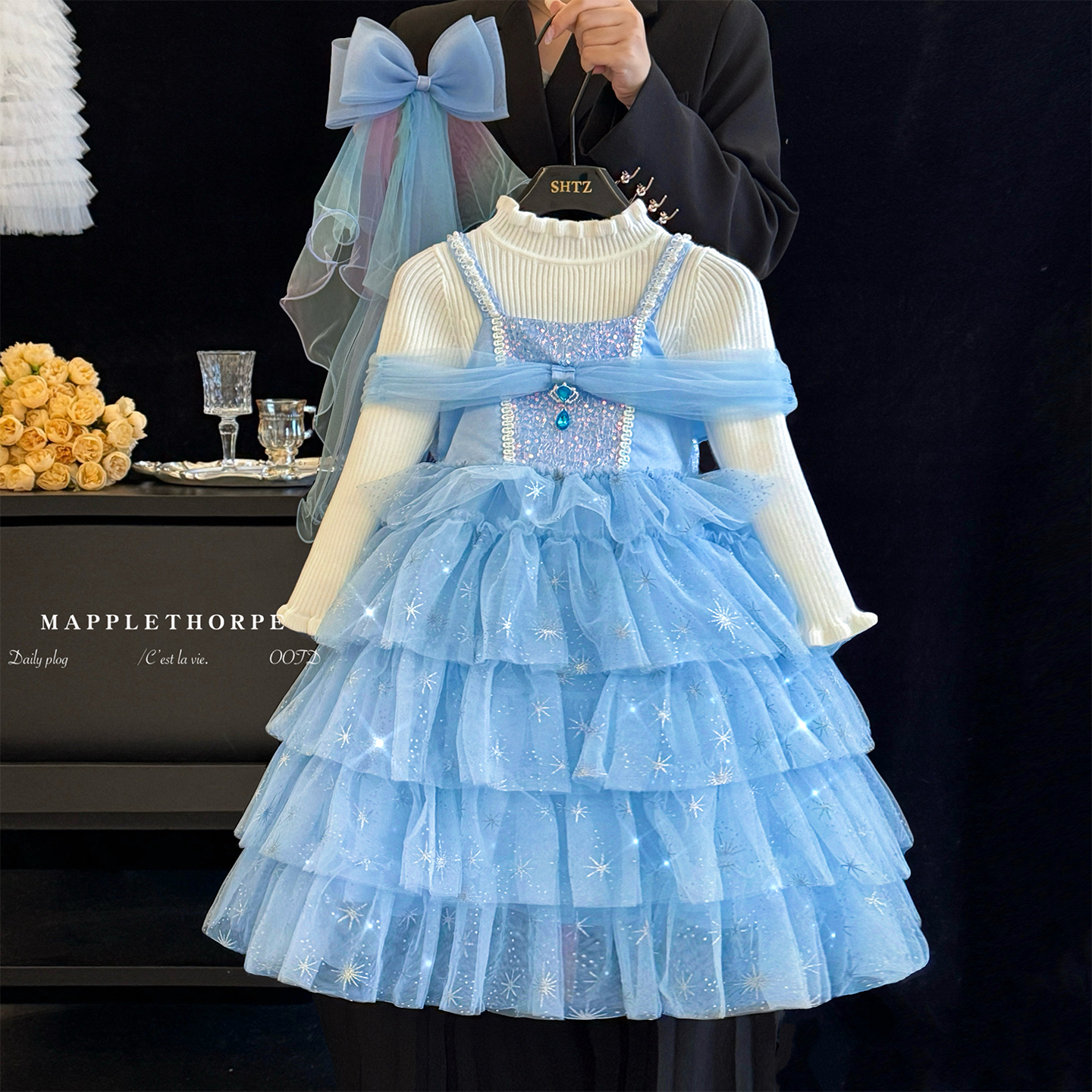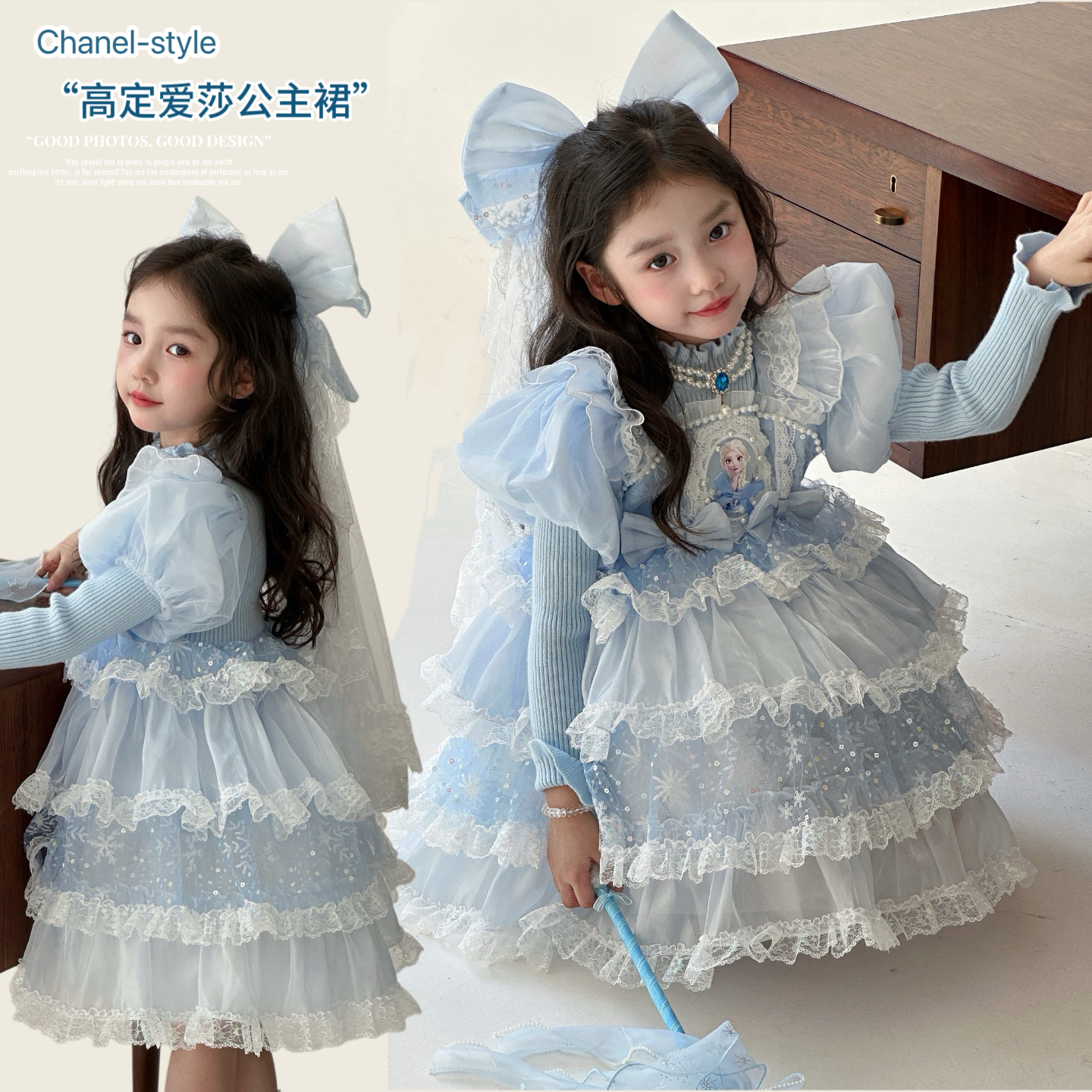 高端爱莎公主裙秋冬季女童洋气洛丽塔冰雪奇缘生日礼服艾莎毛衣裙