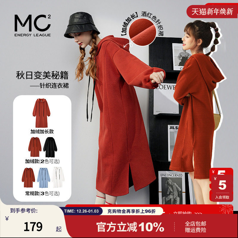 mc2加绒长款连帽卫衣裙女2025冬过膝酒红色针织连衣裙时尚打底裙