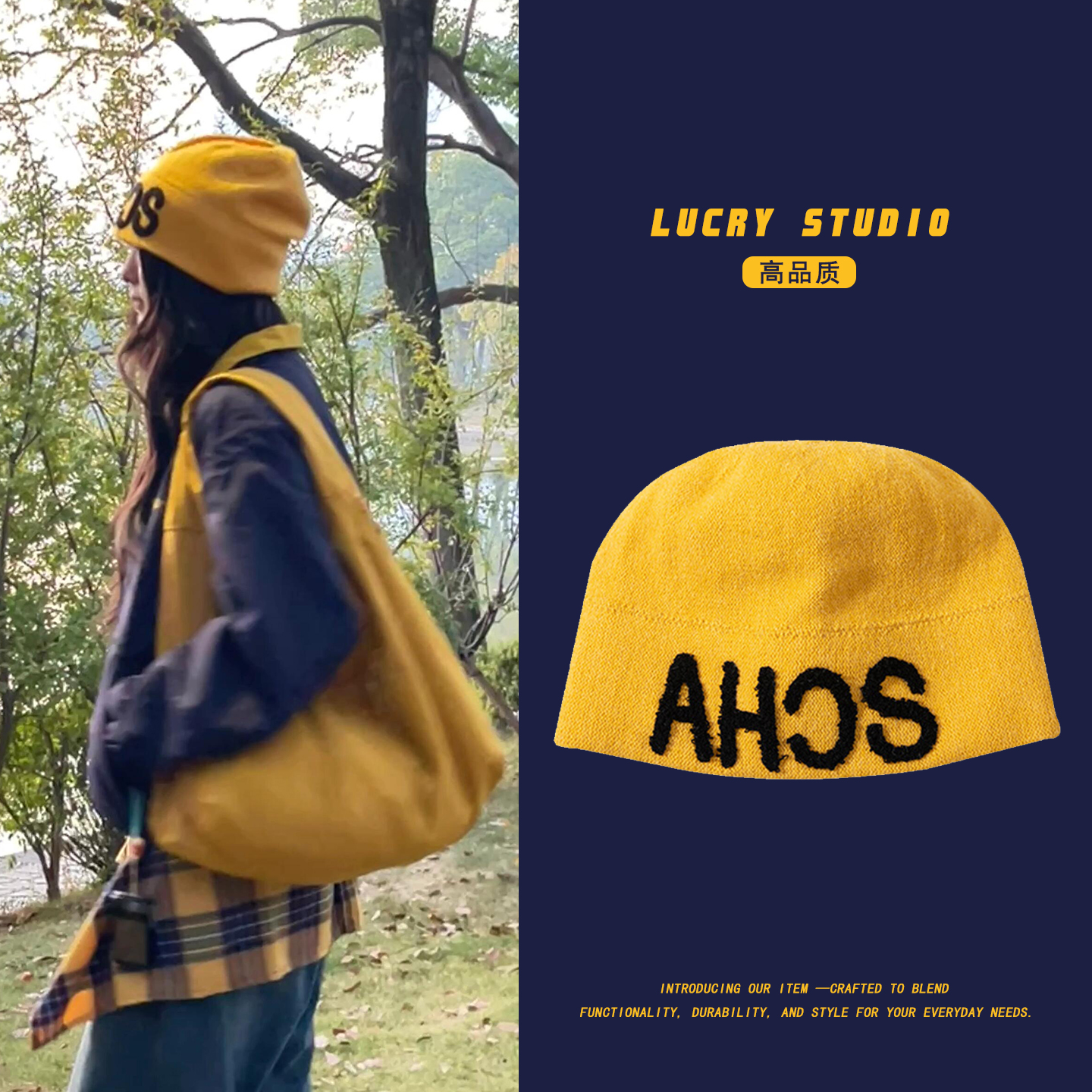 韩国字母帽子女套头嘻哈潮流针织保暖秋冬季毛线帽堆堆包头帽黄色