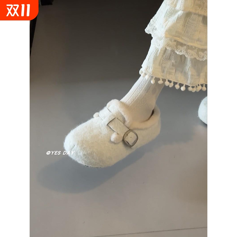 白色日系jk百搭配裙子加绒勃肯鞋女2025冬季新款大头平底毛毛拖鞋