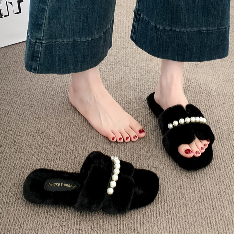 宝小姐2025软底秋冬新款平底一字拖黑色毛毛拖鞋外穿毛茸茸棉鞋女