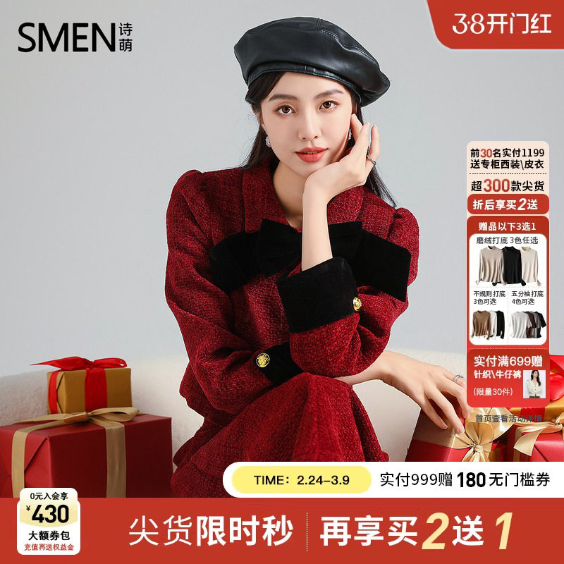 Smen诗萌加厚毛呢长款冬裙套装两件套韩版高级感红色小香风连衣裙