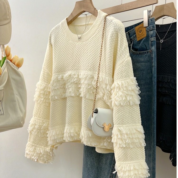2024冬季韩版新款圆领套头名媛彩色流苏长袖针织毛衣毛绒绒外套女