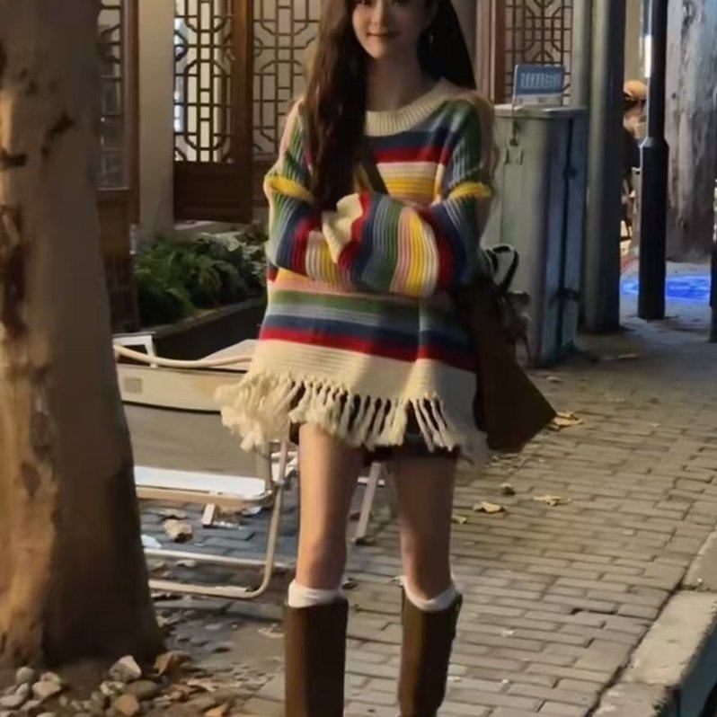 2025秋冬韩版慵懒宽松外套潮森系民族风彩虹条纹流苏套头毛衣女装