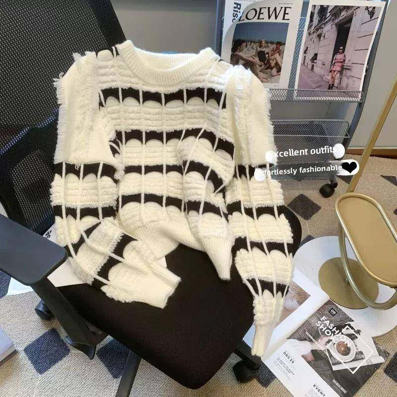 条纹针织打底衫女秋冬2025新款韩版时髦套头泡泡袖毛衣设计感流苏