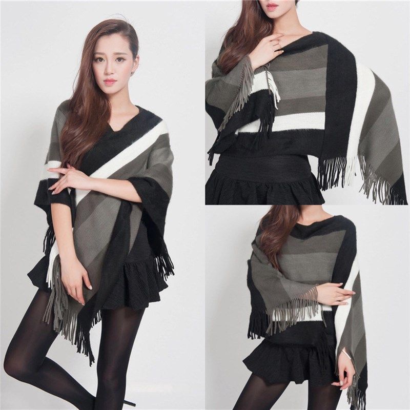 韩版女装流苏套头中长款针织斗篷女2021冬季时尚披肩条纹毛衣外套