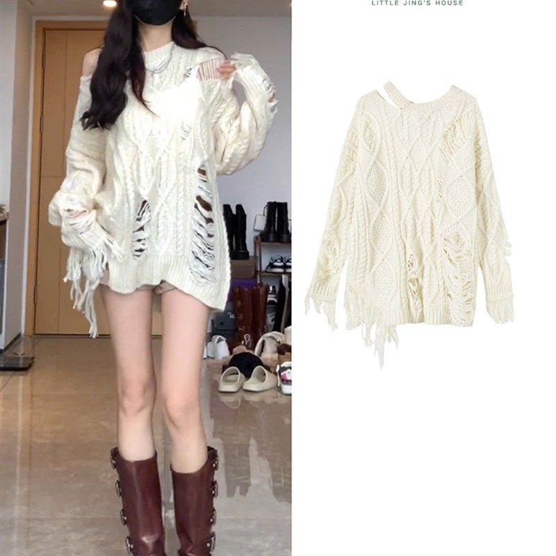 韩版慵懒风杏色破洞露肩针织衫女2024设计感套头宽松镂空流苏毛衣