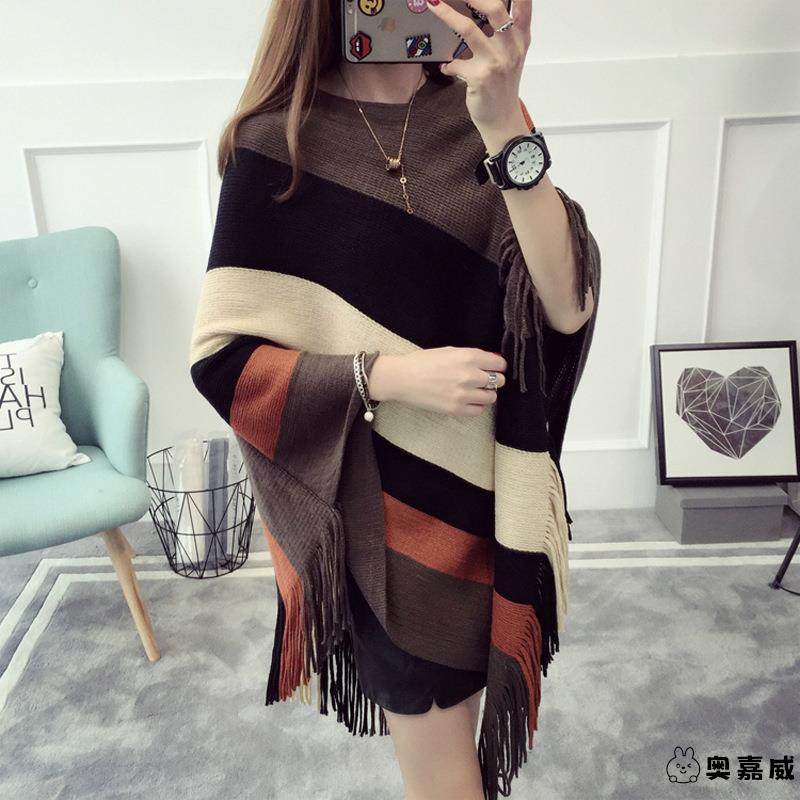 2025春秋新款韩版女装宽松流苏套头毛衣斗篷披肩针织衫条纹外套秋
