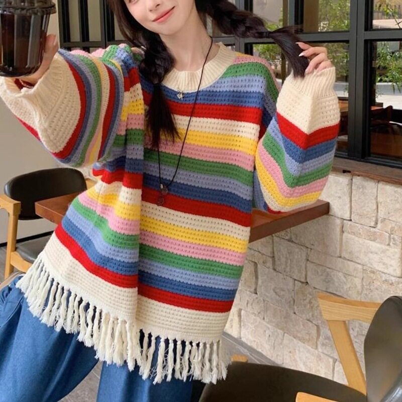 彩虹条纹毛衣女秋冬新款宽松显瘦流苏套头韩版休闲洋气针织衫上衣