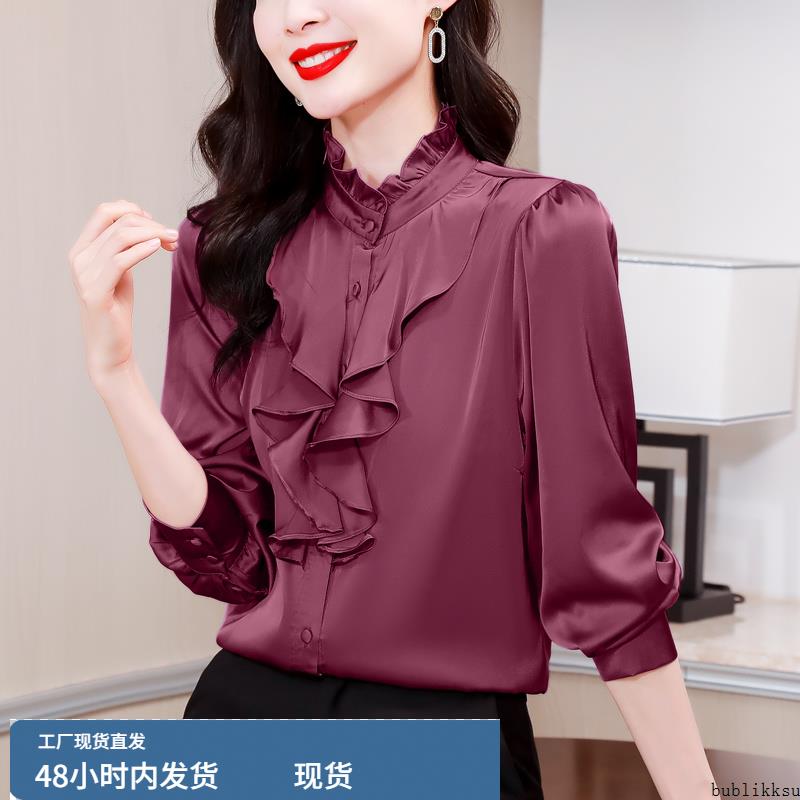 高级感缎面长袖衬衫女士秋装时尚减龄荷叶边小衫洋气显瘦雪纺上衣