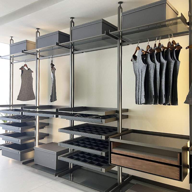 走入式现代简约整体衣柜轻奢极简铝合金立柱式玻璃层板衣帽间陈列