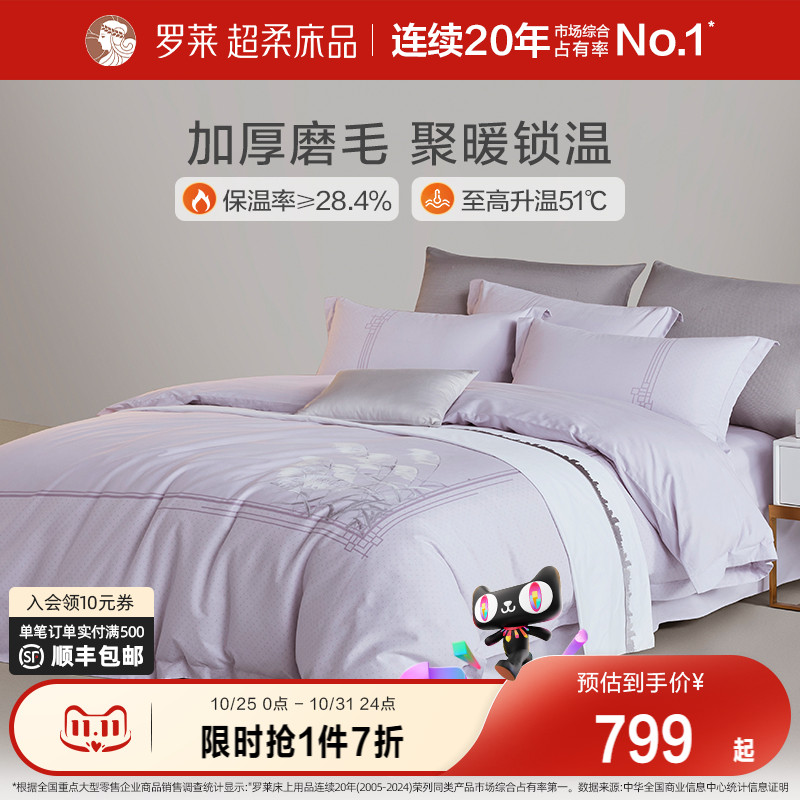 罗莱家纺秋冬全棉加厚磨毛简约床单被套田园风1.8米双人床四件套