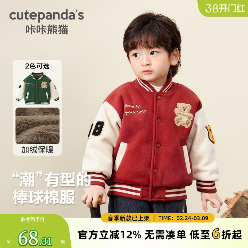 咔咔熊猫儿童冬季外套男童女童红色秋冬款棒球服宝宝冬装加厚棉服