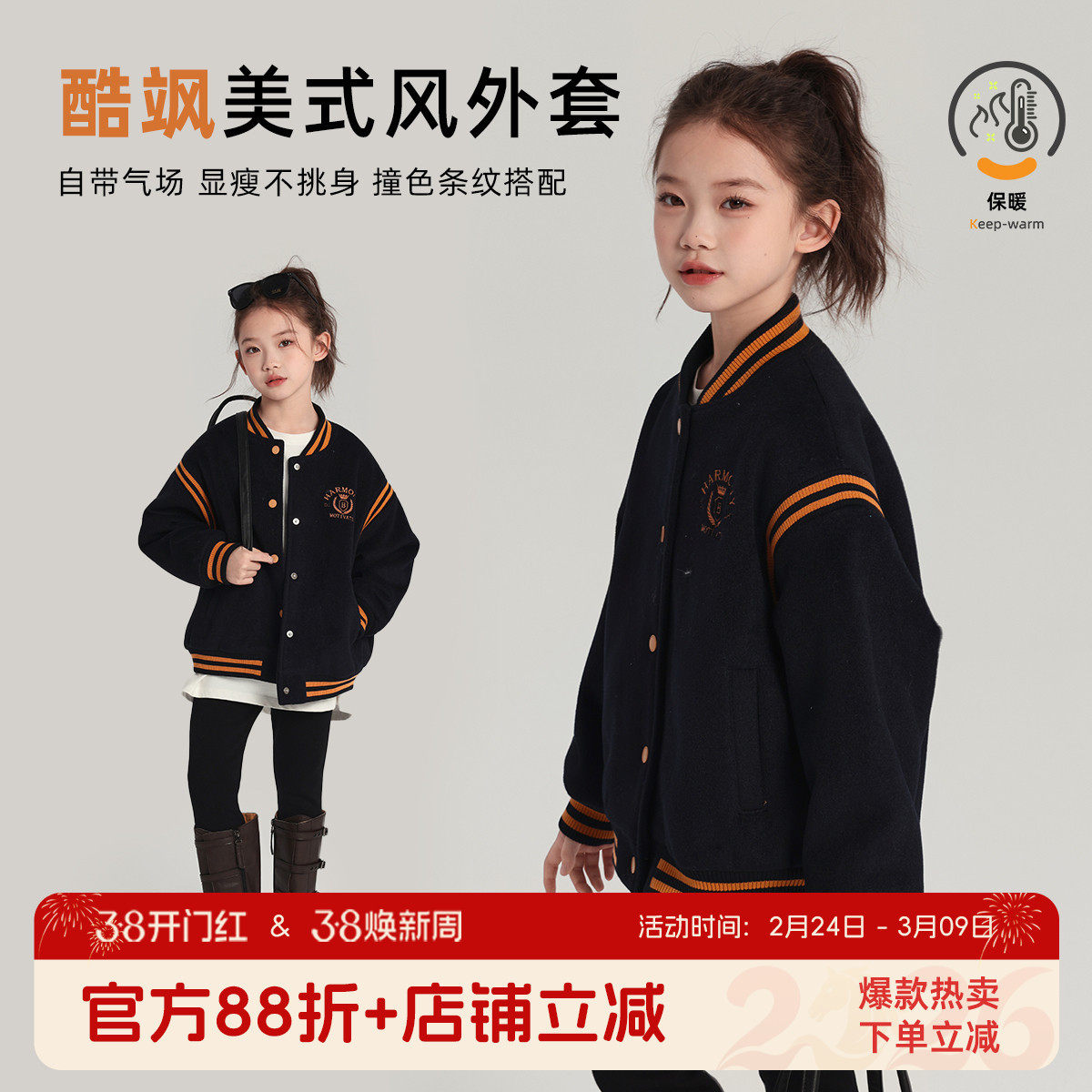 女童春装2026新款外套新款儿童洋气加绒加厚棒球服秋冬款女孩上衣