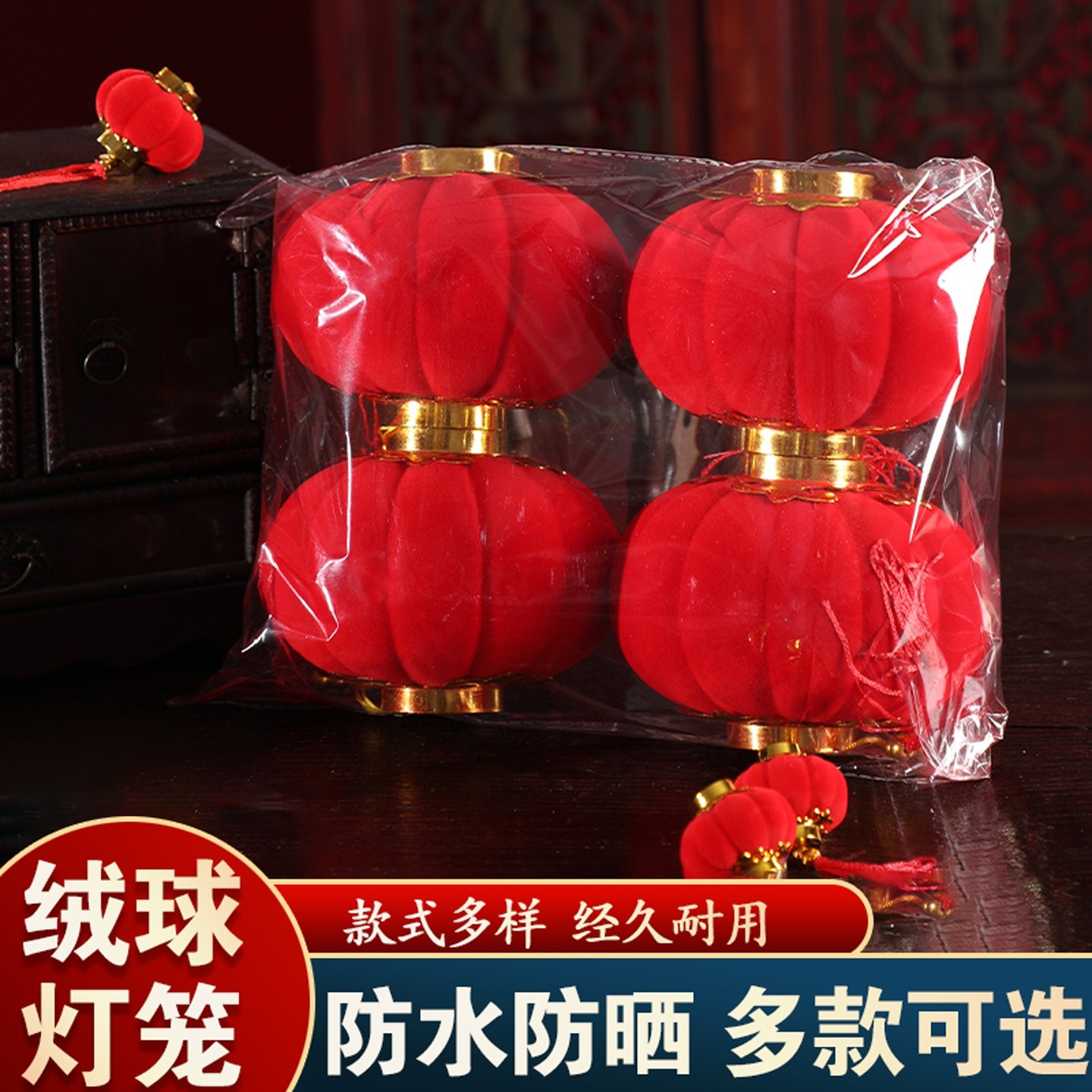 植绒球小红灯笼新年春节过年室内盆景户外防水灯笼结婚商场景布置