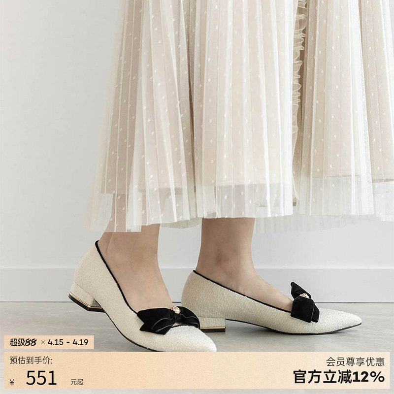 RANDA 25早秋新款天鹅绒蝴蝶结珍珠纽扣休闲平底高跟鞋 PP36008