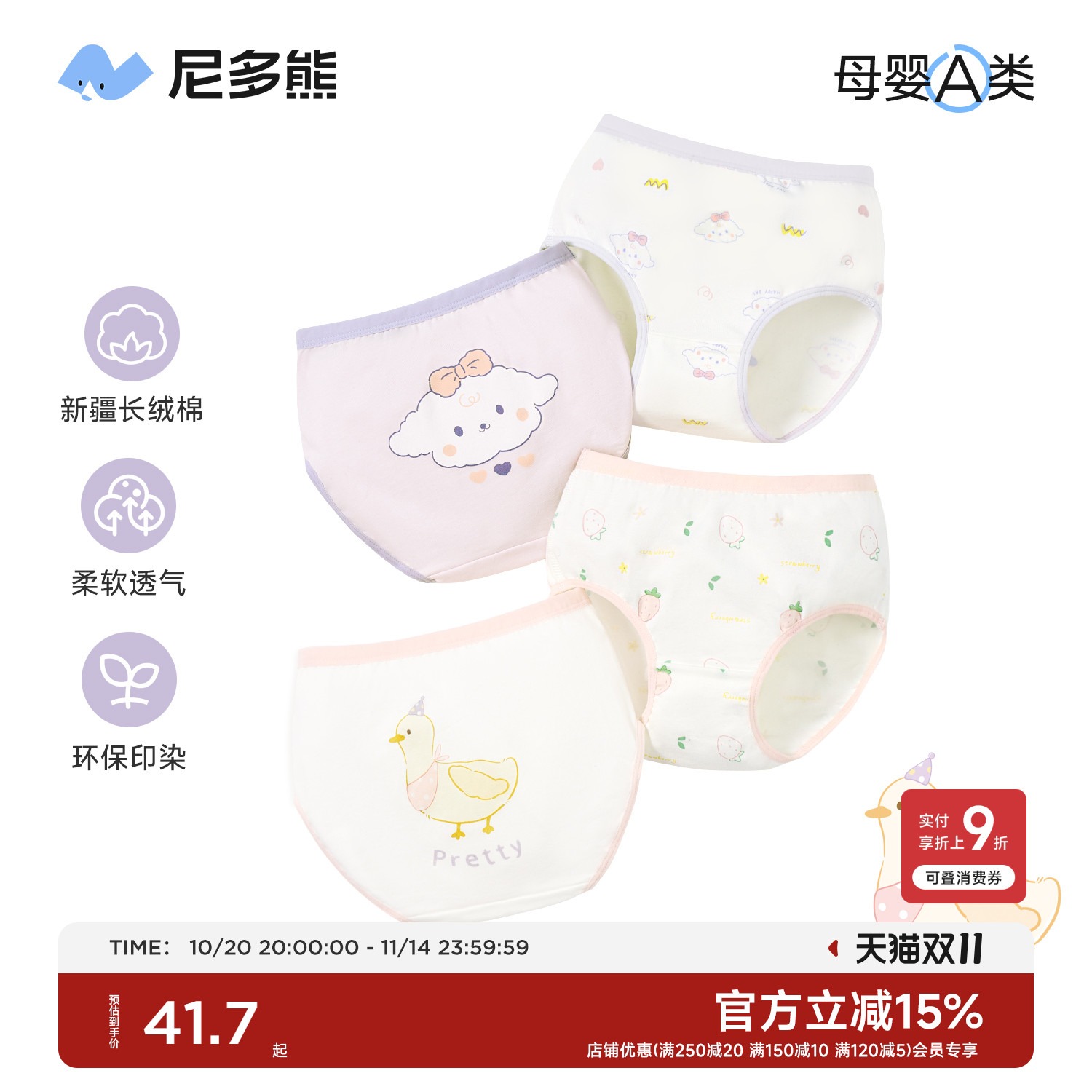 [4条]宜而爽纯棉内裤女10A抑菌全棉内裆中高腰女士三角裤薄款夏季
