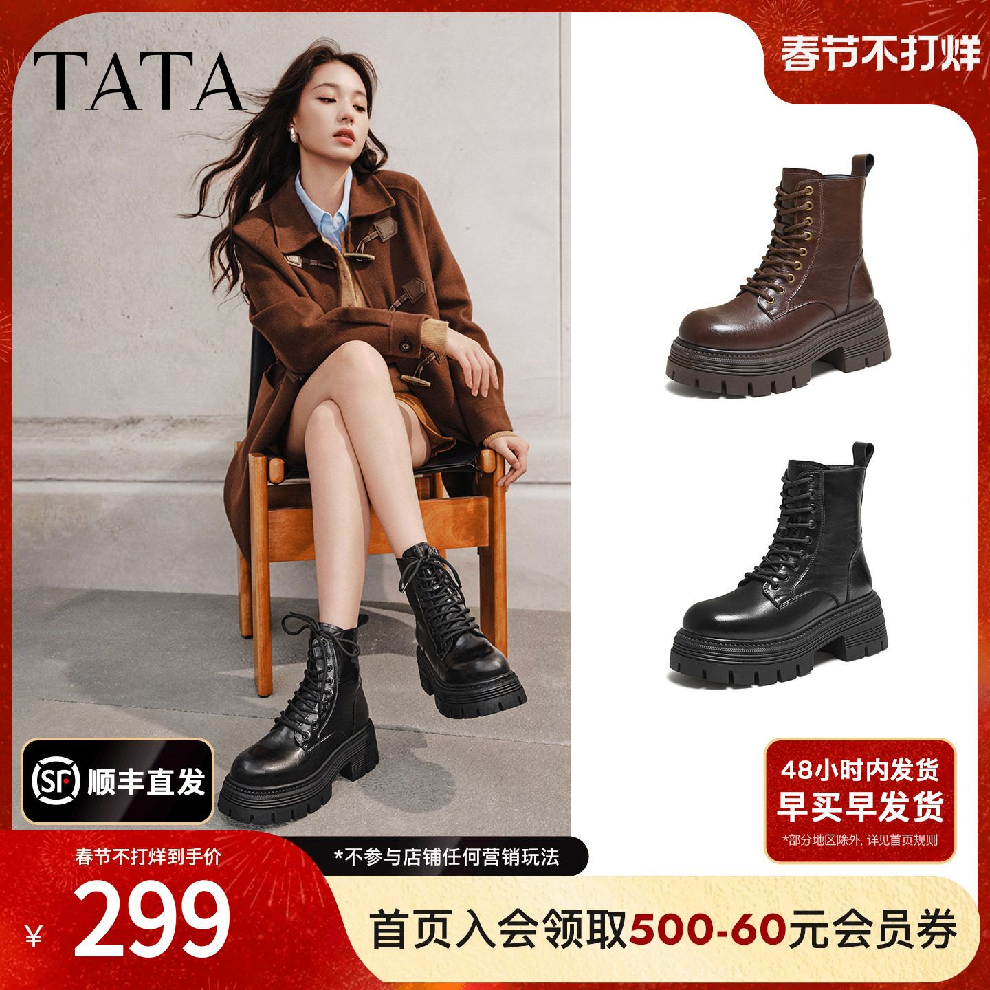 TATA他她靴子女鞋冬季加绒英伦工装靴厚底马丁靴羊皮短靴WXB06DD5