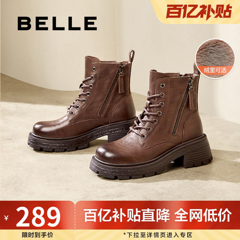 百丽女靴子厚底复古马丁靴冬新英伦风真皮短靴加绒时装靴D3F1DDD4
